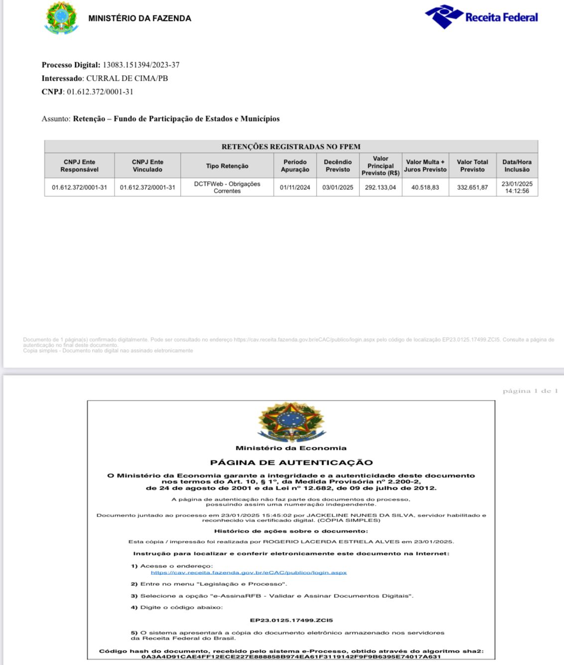 A Receita Federal informou a Prefeitura de Curral de Cima que fará uma retenção no Fundo de Participação dos Municípios (FPM), para pagar um débito, da gestão anterior, gerado por conta do atraso no repasse do INSS, do período de novembro de 2024. A retenção programada é de R$ 292.133,04 (duzentos e noventa e dois mil, cento e trinta e três reais e quatro centavos) pelo atraso, acrescida de mais R$ 40.518,83 (quarenta mil, quinhentos e dezoito reais e oitenta e três centavos) de multa e juros.